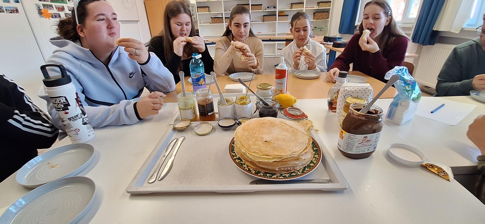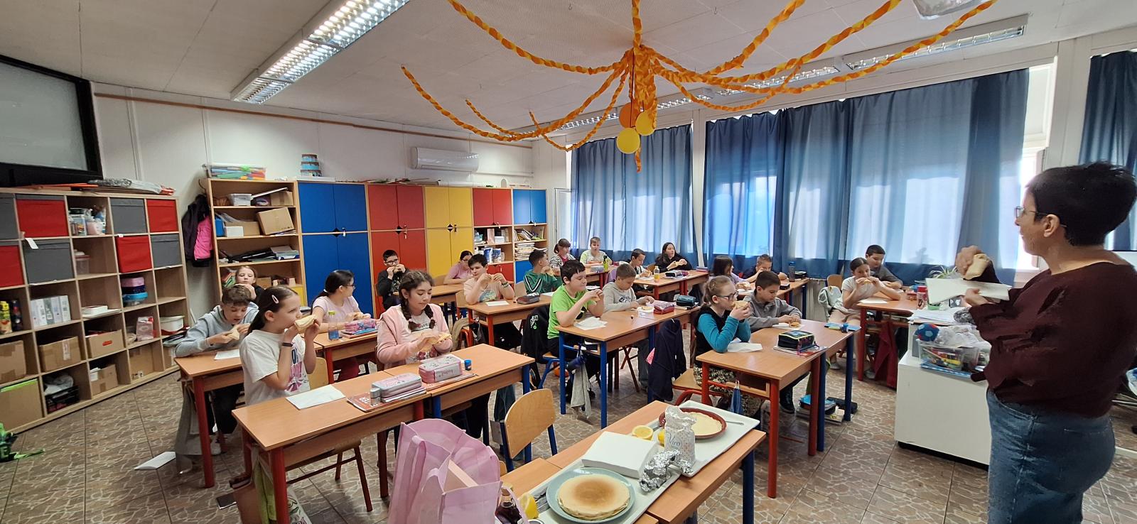 A 4., 5., 6. és a 7. osztályokban vidám palacsinta napot tartottunk. A hagyomány a húsvéti nagyböjtöt megelőző húshagyókeddhez kapcsolódik. Az angolszász országokban ilyenkor a kamrában maradt tejből, tojásból és zsiradékból készítettek palacsintát a 40 napos böjt előtt. Ez egy népszerű ünnep, amelyhez sok helyen még palacsintasütő versenyek is tartoznak.